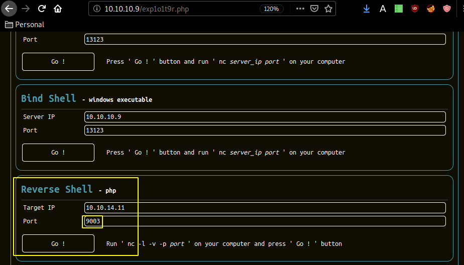 Browse to http://10.10.10.9/exp1o1t9r.php logging in with his credentials : b374k and then browse to the reverse shell tab and select php reverse shell clicking Go once your terminal's netcat command is ready