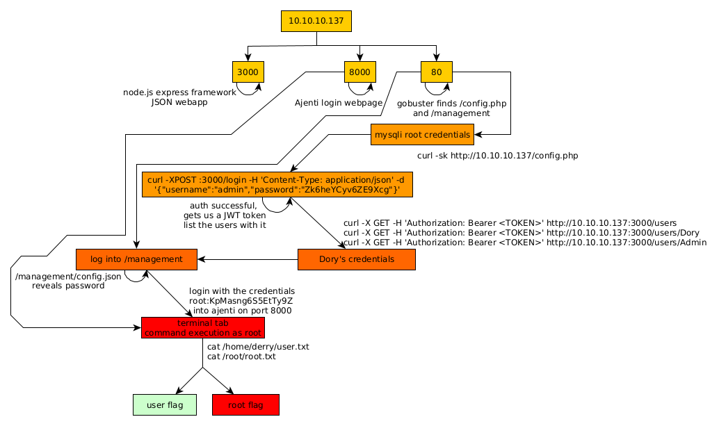 Which gives us credentials for a database on localhost root:Zk6heYCyv6ZE9Xcg. Now back on port 3000 the error message was "auth token is not supplied" Therefore we could use curl to supply the needed parameters of said token, whose password is the one we found earlier, but we had to guess the username, which was "admin"