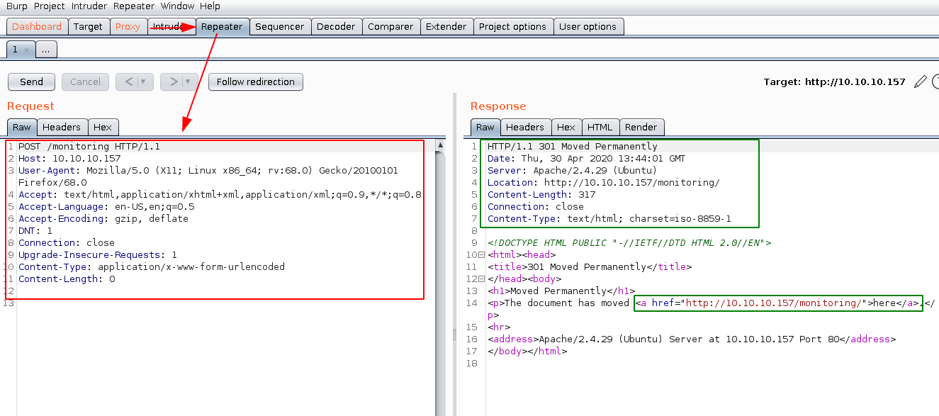 We get a redirection to the /monitoring/ tab which is quite odd, and if we keep switching from GET to POST at some point we sumble upon this particular response: