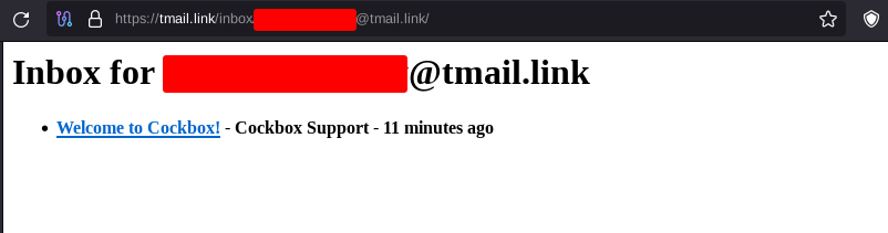 In our example below we'll use Cockbox. but first thing we need is a non-KYC email provider, to do so we could follow Privacy Guides' recommendation and create an account on Tuta, but for simplicity I'll use a temporary email from tmail.link (now defunct). You can use cs.email or yopmail instead.