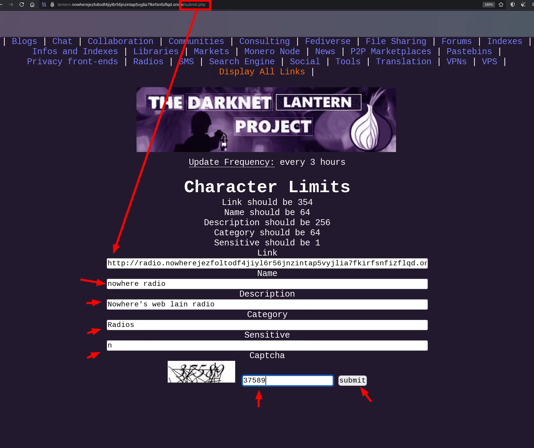 From here, anyone can mention the new link to submit, the name of that link, the description, the category name, and wheter or not the link is sensitive (related to drugs) or not. And lastly, to prevent spam, we also implemented a Captcha mechanism.