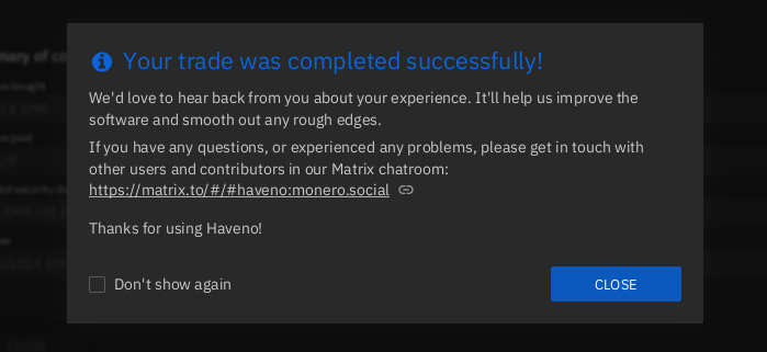 And lastly, Bob gets his Monero without any issue (he needs to wait 20 minutes for the monero to be spendable from his haveno monero wallet):