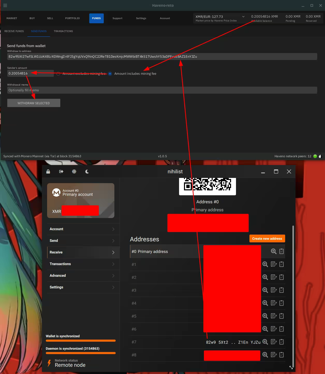 And then he can also withdraw his monero from his Haveno DEX to his other monero wallet like so: