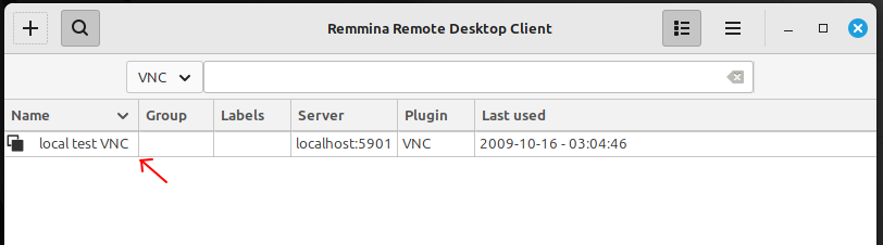 Still on our client machine, we open Remmina and add a VNC connection, this time at port 3309 and with no user/password. You can also set the depth to 16 to match our server (which we'll setup later).