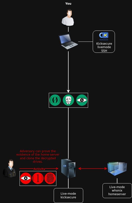 If they touch the mouse or keyboard, they will invariably trigger the emergency reboot, which prevents them from being able to prove the existence of a hidden volume and the sensitive whonix VM inside it.