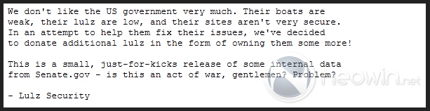 The next target was the British National Health Service, although in this instance the group stated that the intrusion was intended solely to highlight security vulnerabilities. The situation was different with the United States Senate website, where LulzSec released users' email addresses and passwords.