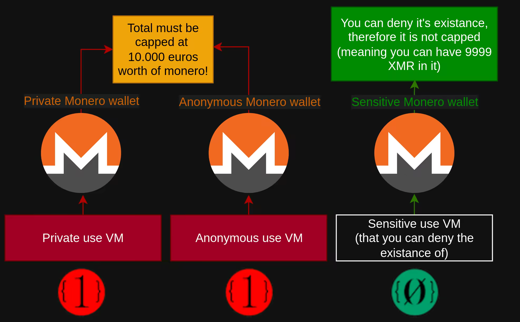 Therefore, That's why we need to cap the total amount of monero stored in wallets that we carry to the maximum legal amount of cash we are allowed to carry wherever we cannot deny it's existance. We have the sum of the private and anonymous monero wallets that cannot go beyond 10000 euros (legally) because we cannot deny their existance, and meanwhile we can store an indefinite amount of monero on the sensitive monero wallet, that is stored inside the Sensitive use VM.