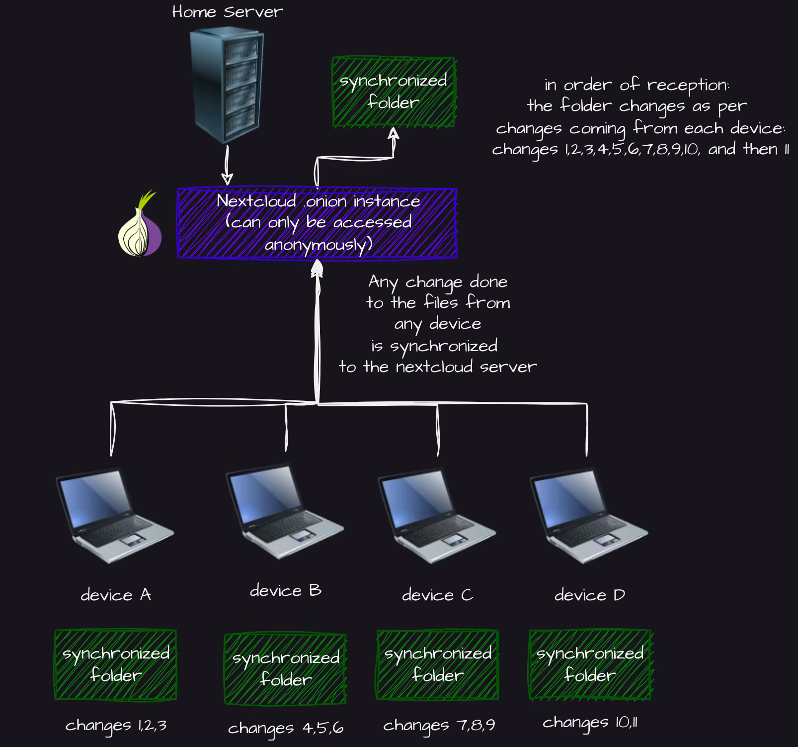 What we are trying to achieve here, is a setup where we can have a single folder synchronized on multiple devices, so that any change done from any of those devices, to that same folder, gets to be automatically shared and synchronized accross all of the other devices aswell. And of course, we're going to achieve that while maintaining our anonymity, by routing all traffic through Tor.