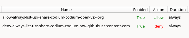 After, VS Codium wants to connect to a different domain now. But this time we want the app to be able to access this domain. So we do the same thing as above, but click Allow. So the created rule says: "Always allow VS Codium to make requests to the domain open-vsx.org"