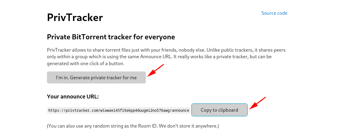 Sam is now ready to share a file with Larry. He has a 10GB file of "linux ISOs" for which he will need to create a .torrent file. To help with this, Sam will use PrivTracker, a private BitTorrent tracker, to announce his .torrent file. Sam generates a private announce URL on the PrivTracker website and copies it to his clipboard.