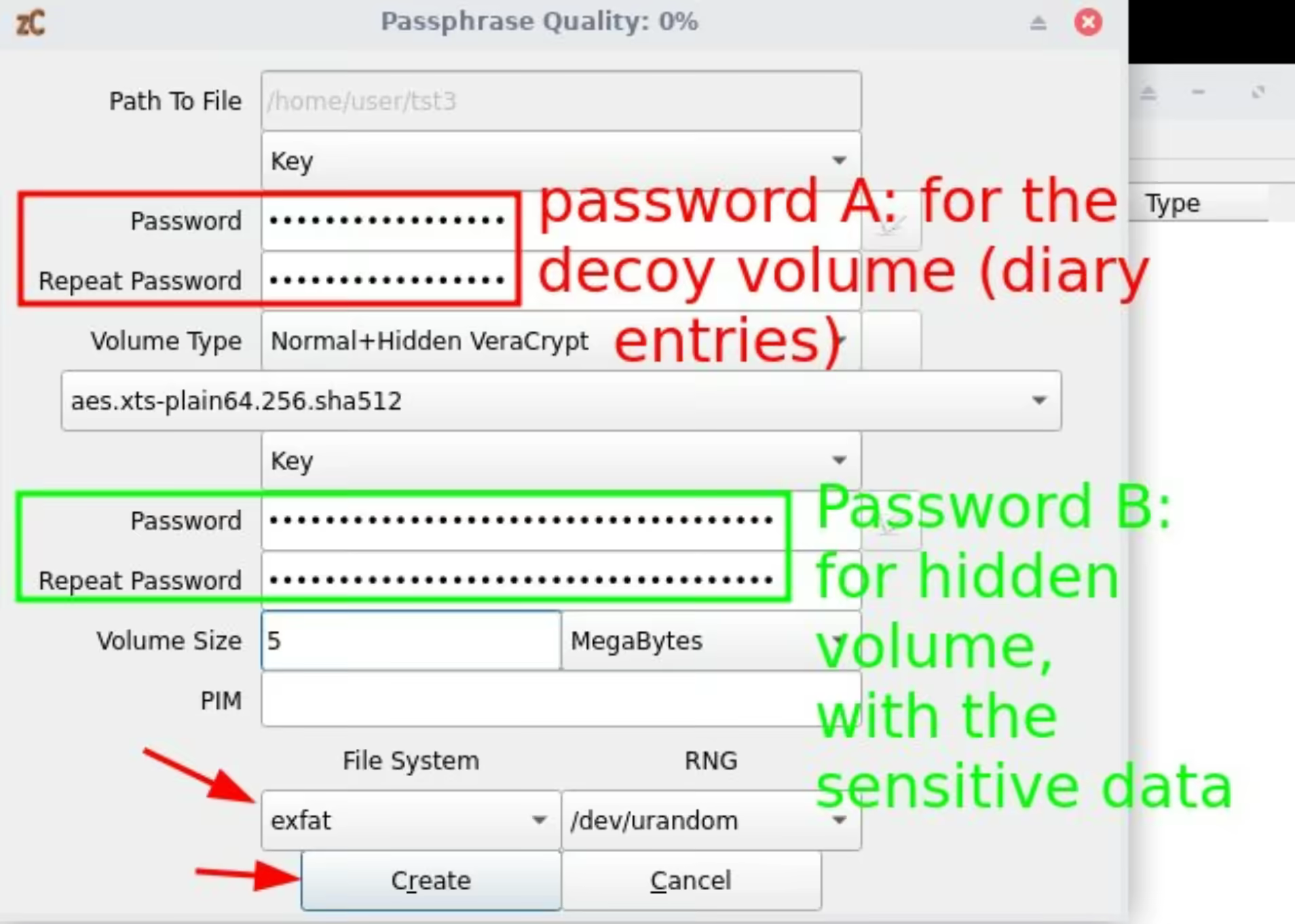 This small veracrypt volume will be called "diary" and it's decoy partition will simply contain a text-based diary of yours. However we need to be careful as we're going to save that file in places that the adversary may access, We need to make sure that the decoy volume data changes, every time the hidden volume changes. This is because otherwise we wouldn't have a way to justify why the overall veracrypt volume changed while the decoy volume didn't change (which would then prove the existance of the hidden volume).