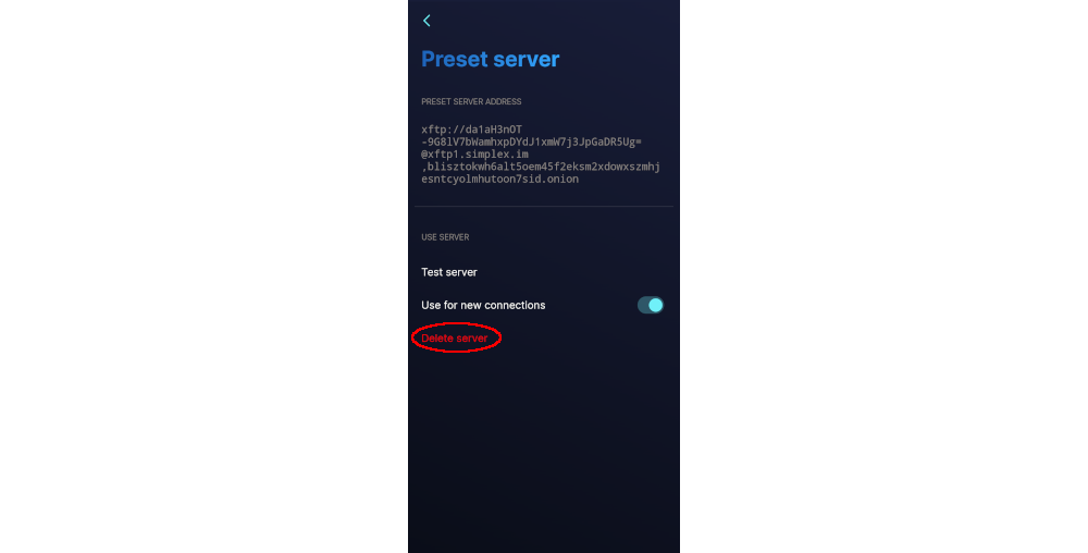 With our self-hosted SMP server set, it's time to remove the default SimpleX servers. Click on each of the presets, then click Delete server.