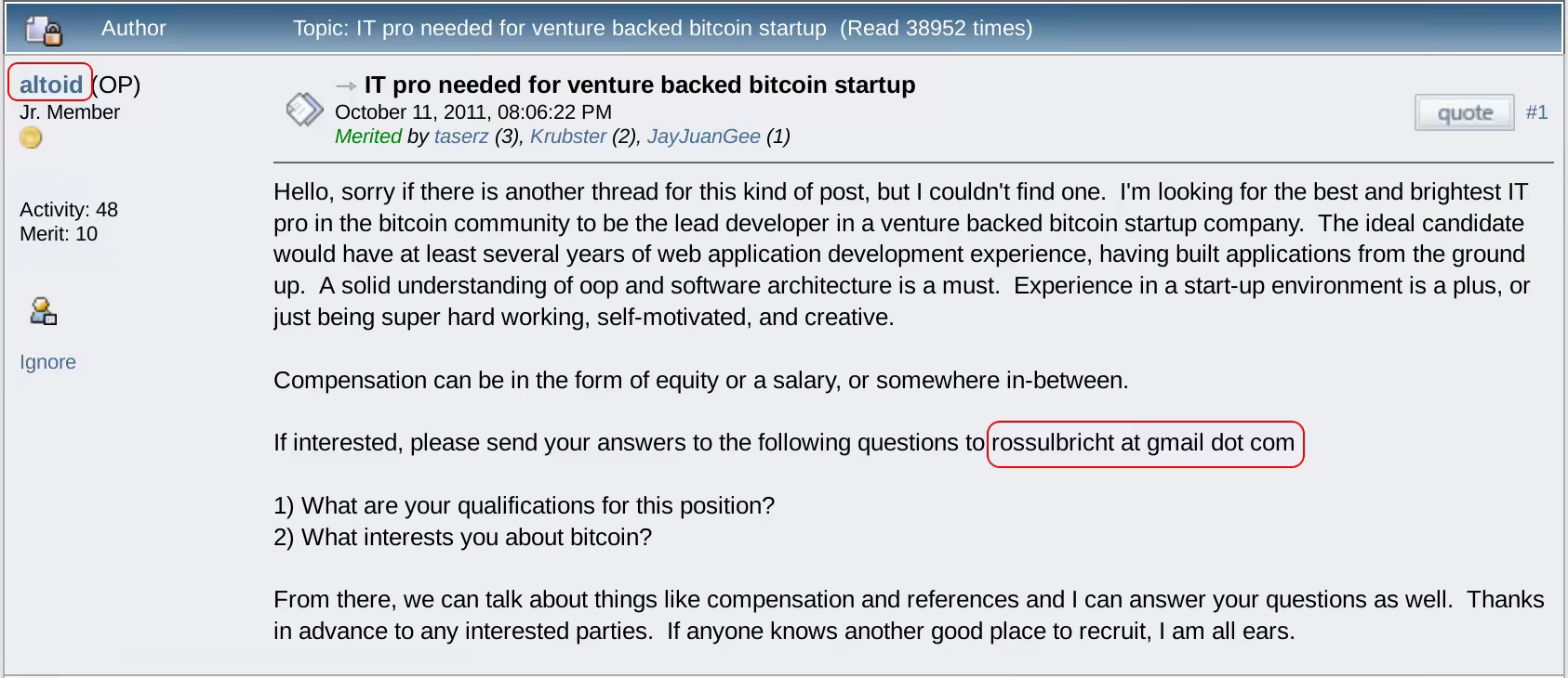 Upon searching for more posts by "altoid," law enforcement found a post titled "IT Pro Needed for Venture Backend Bitcoin Startup." This was a job advertisement for a Bitcoin-related project, and it included the email address rossulbricht@gmail.com for further contact.