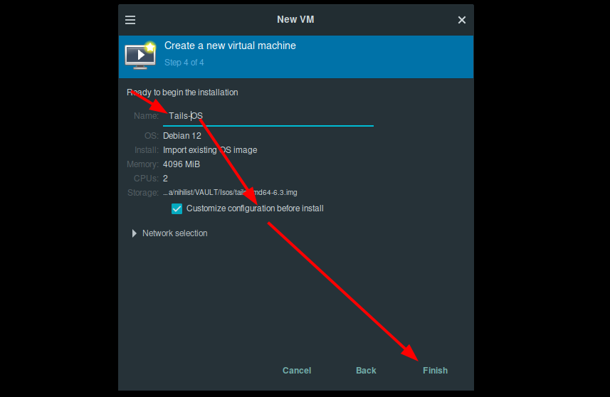 Now in the same way (even though it is a less-popular setup) we can also we can create a Tails OS QEMU VM in virt-manager like so: