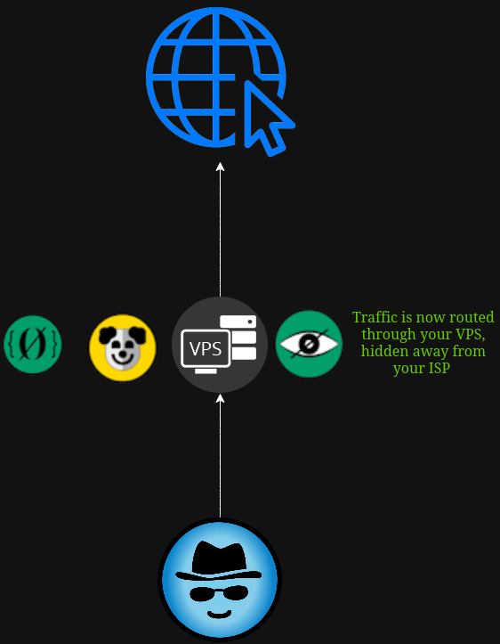 And now you have a VPN set up in your own VPS connected to every boot from your home computer using either wireguard or openvpn. Your path to the internet should now be like below, completly private from your ISP routed through your remote VPS. Sacrificing a bit of anomonynity to secure your privacy.