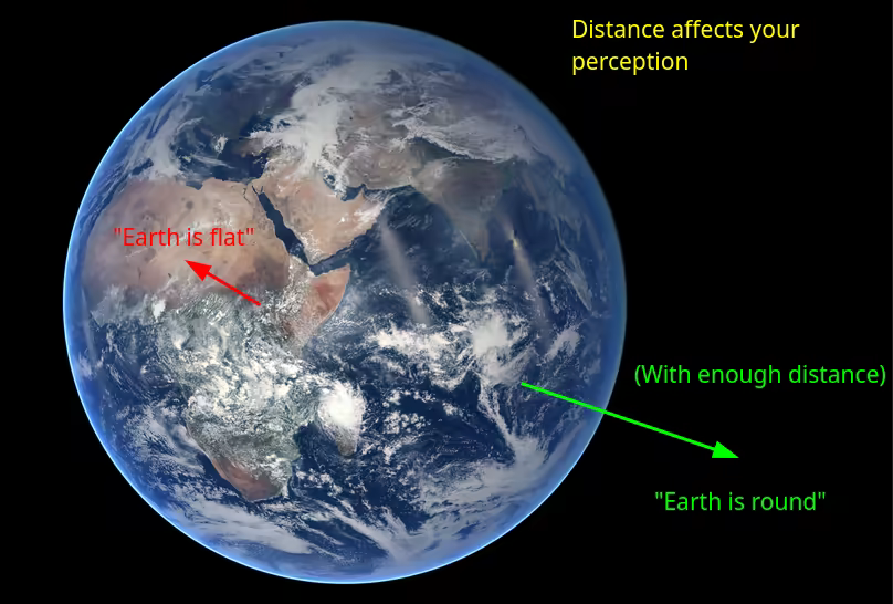 In the same way, if you spend your whole life on the ground over time you'll end up thinking that the earth is flat, but if I put you in a space rocket to go up in space far enough, with enough distance you'll be able to percieve that the earth is round.